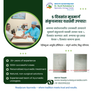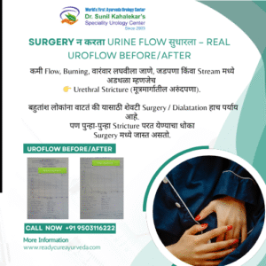 Case Studies Urethral Stricture Reports Successful Ayurvedic Management of Ureteric Stricture Without Surgery September 20, 2025 / November 12, 2025 by admin | Leave a Comment 📍 Contact Us Dr. Sunil Kahalekar, MD (Ayurveda)Founder – Readycure Ayurveda HospitalDoctor Lane, Nanded📞 9422188788 Ayurveda #UretericStricture #AyurvedicTreatment #Nanded #ReadycureAyurveda #DrSunilKahalekar आयुर्वेद #UretericStricture #आयुर्वेदिकउपचार #नांदेड #ReadycureAyurveda #DrSunilKahalekar Read more »